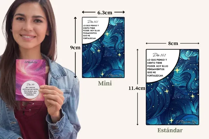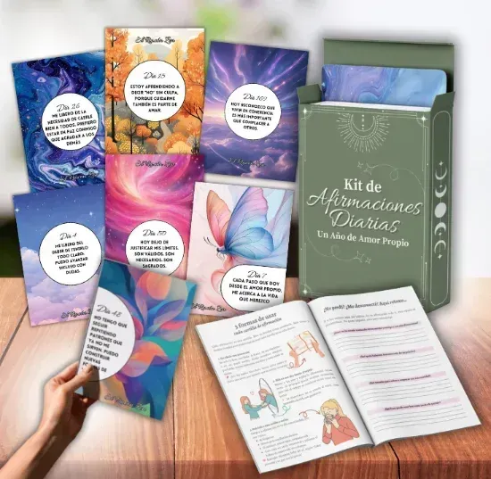 Este kit fue diseñado para acompañarte durante 365 días con afirmaciones que no solo te motivan, sino que transforman la forma en la que te hablas a ti misma.