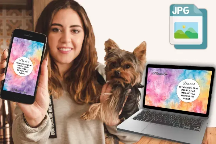 También recibirás cada afirmación en formato JPG de alta calidad y en 2 versiones. Así podrás verla en cada momento. Ideal para fondo de pantalla de tu celular o de tu computadora.